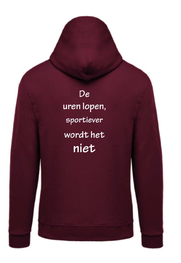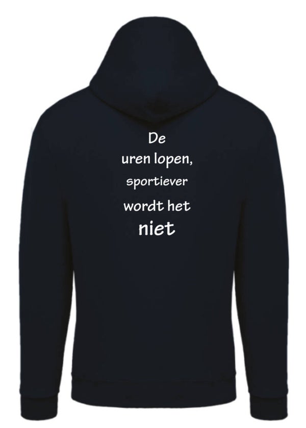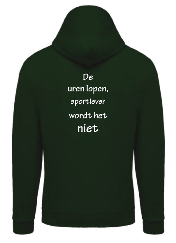 Koop een trui met de tekst 'De uren lopen, sportiever wordt het niet' en krijg een gratis T-shirt!